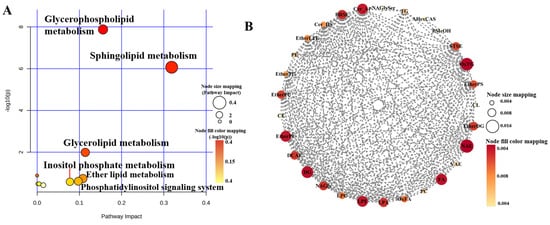 Based on significantly distinct lipid metabolites, the lipid molecules were analyzed for their impact on metabolic pathways. As depicted in Figure 8A,D, the differential lipids in both goat milk and human milk influenced the following three metabolic pathways: glycerophospholipid metabolism, sphingolipid metabolism, and glycerolipid metabolism. However, in the comparison between human milk and goat milk, the differential lipids also influenced ether lipid metabolism, the phosphatidylinositol signaling system, and inositol phosphate metabolism. Wang et al. [52] also obtained similar results in their study. Subsequently, a correlation analysis of the differential lipid molecules in each group was performed using MetaboAnalyst 5.0 (http://www.metaboanalyst.ca) accessed on 1 January 2023. (Figure S6). Lipid molecules with correlations greater than 0.9 or less than −0.9 in the comparison between human milk and goat milk were imported into Cytoscape 3.0 for molecular network analysis. Following the methodology of Ma et al. [53], we calculated the scores of each differential lipid using twelve topological analysis methods in CytoHubba and selected those with the highest combined score as biomarkers.