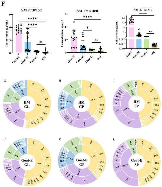 Metabolic pathway analysis of differential lipids. Analysis of metabolic pathways (A), molecular correlation network (B), and biomarker levels (C) of common differentiators in human milk and goat milk comparison groups, analysis of metabolic pathways (D), molecular correlation network (E), and biomarker levels (F) of common differentiators in a comparison group of goat milk during different lactations. Abundance distribution of fatty acids (FAs) in the GL, GP, and SP lipid molecules of HM (G–I) and Goat-E (J–L). * is p < 0.05, ** is p < 0.01, **** is p < 0.0001, “ns” is no significant.