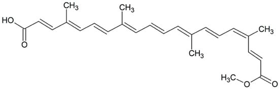 Bixin is a dicarboxylic cis-apocarotenoid monomethyl ester with a high number of conjugated double bonds. It mostly occurs in annatto seeds (Bixa orellana L.) [7], making up at least 80% of the total carotenoids in the seed [8]. It has the molecular formula C25H30O4 and is present in the outer coating of the grains of the plant [9]. It is considered a natural dye responsible for shades ranging from yellow to red.