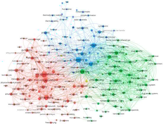 Bibliometric map obtained by VOSviewer software version 1.6.16 (https://www.vosviewer.com, accessed on 25 March 2024), using “bixin” and “freeze-drying” or “lyophilization” as keywords, recorded from Scopus database (recorded on the 25 March 2024).