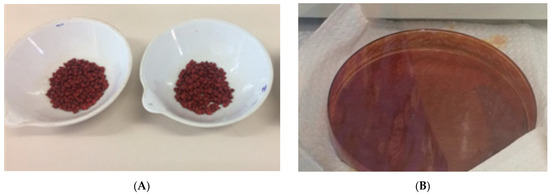 For the integer annatto seeds in natura, the following values have been reported: moisture 14.0 ± 0.1%, lipids 4.0 ± 0.3%, bixin 2.0 ± 0.2%, and other material up to 80% [31]. Thus, considering the variability of cultivars, soil, and storage conditions, the values found here differ from the mentioned data. The yield of the bixin extraction process from annatto seeds is a determining factor for the economic viability of this carotenoid in the industry. The extraction of bixin crystals has its yield calculated by the ratio between the amount of powder produced at the end of the extraction and the initial amount of seeds. Using the methodology adopted in this work, a yield of 1.5 ± 0.2% was obtained. Figure 4 shows the visual appearance of the annatto seeds in natura and the bixin crystals extracted from the seeds.
