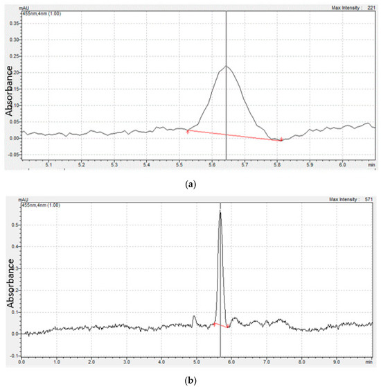 Figure 5 shows the chromatogram of the bixin standard (>90% purity—Figure 5a) and the bixin sample obtained after extraction (Figure 5b).
