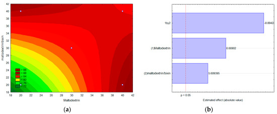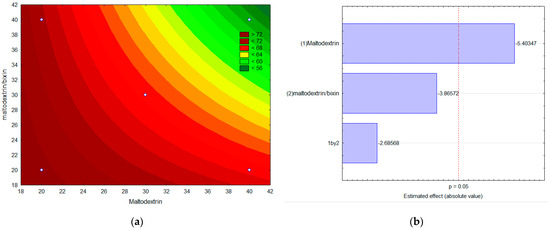 Figure 8 shows the contour curves (Figure 8a) and Pareto diagram (Figure 8b) for the variable solubility response of the microencapsulated powder in water as a function of the variables’ maltodextrin concentration (Figure 8b, column 1) and maltodextrin/bixin ratio (Figure 8b, column 2).