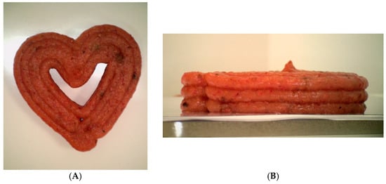 A Foodini 3D printer (Natural Machines, Barcelona, Spain) with a nozzle diameter of 4 mm was used for the 3DP of the functional snacks. A 3D heart shape (Figure 1A) with three layers (Figure 1B) was designed using the Foodini Creator computer program. The 3DP was performed with two different programs (P1 and P2), differing in the printing speed (8000 mm min−1 vs. 14,000 mm min−1), printing line thickness (3.5 mm vs. 3.4 mm), mixture flow rate (1.4 vs. 1.65 (dimensionless)) and nozzle height of the first layer (6 mm vs. 4.5 mm). The dimensions of the 3D-printed objects were 53 mm (length) × 51 mm (width) × 12 mm (height).