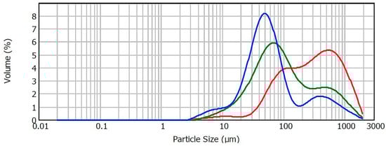 The particle size distribution of the samples in the Hydro 2000S system was determined using the laser diffraction method (Malvern Masterseizer 2000, Malvern Instruments Ltd., Worcestershire, UK). Within the cylinder, 10 g of dissolved sample was dispersed in 30 mL of distilled water, ensuring the homogeneity of the solution for the measurement and achieving a minimal degree of obscuration. The particle diameters were expressed over D (3.2); D (4.3); d (0.1); d (0.5); and d (0.9).