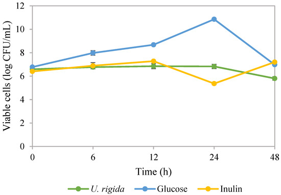 The procedure was modified from the method presented by Song, et al. [24] to analyse the impact of polysaccharides from U. rigida on probiotic growth. Lactobacillus rhamnosus ATCC 53103 was used as the reference bacterial strain for the probiotics. First, L. rhamnosus ATCC 53103 was prepared in MRS broth and incubated at 37 °C for 18 h. Then, 10% (v/v) of L. rhamnosus ATCC 53103 was transferred to MRS broth and incubated at 37 °C for another 12 h. The cells were centrifuged at 3660× g for 10 min, washed twice with 0.1% peptone and resuspended in 0.1% peptone. The cells were then diluted to an absorbance of 0.2 at 600 nm to prepare the probiotic bacterial suspension. Next, a L. rhamnosus ATCC 53103 bacterial suspension of 10% (v/v) was inoculated into minimum medium broth supplemented with 2% (w/v) freeze-dried polysaccharides from U. rigida, while glucose and inulin were utilised as the controls. The bacterial mixture was cultured at 37 °C for 48 h and samples were collected at 0, 6, 12, 24 and 48 h to evaluate the viable cells of L. rhamnosus ATCC 53103 using the plate-count method on MRS agar.