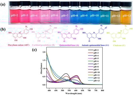 The color responses of the PPA to the pH solutions and their corresponding UV-vis spectra are depicted in Figure 1. The PPA displayed distinct colors in various pH buffer solutions (Figure 1a). The changes in color and the corresponding peaks were attributed to conformation variations of the anthocyanin structure. At a pH below 3, the bright red color of PPA resulted from the structural form of the flavylium cation (AH+). Light pink was observed within a pH range of 4–6. The nucleophilic attack of the water molecules on the 2-position carbon atom of the anthocyanin B ring caused the breaking of the double bond; as a result, the conjugate system was destroyed and a colorless carbinol pseudobase (B) was formed, and the absorbance gradually decreased. By increasing the pH to 7.0, the structure of the PPA changed to a quinonoidal base (A), resulting in a color shift to purple. As the pH increased to 8, the color of the PPA solution turned blue, which was attributed to the PPA structure changing to a blue anionic quinonoidal base (A−) []. The formation of chalcone (C) led to a color shift toward yellow at pH 12. With the pH changed from acidic to alkaline, the maximum absorption peak of PPA shifted from 527 nm to 605 nm. From the above results, it can be seen that the PPA can respond to pH changes and holds great promise for replacing synthetic dyes in smart films to monitor food quality.