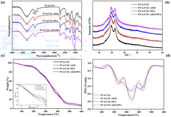 From the FTIR data (Figure 2a), no new bands were observed in the films after the addition of PPA or/and AEO, suggesting that PPA and AEO had no effect on the chemical structure of the PVA/CNC film. For the PVA/CNC film, the bands at 3315 cm−1 and 1039 cm−1 might be attributed to O-H and C-O stretching, respectively []. The bands at 2942, 2917, and 2854 cm−1 can be assigned to the symmetric and asymmetric stretching vibrations of CH from methyl or methylene groups.