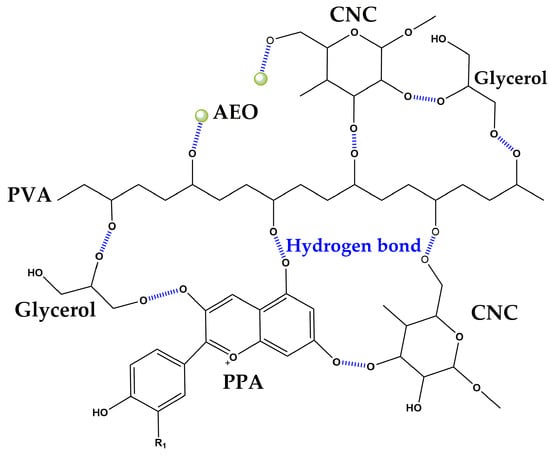 With the addition of PPA or/and AEO, the -OH stretching of the PVA/CNC at 3315 cm−1 shifted lower to 3311 cm−1 (PVA/CNC-AEO), 3299 cm−1 (PVA/CNC-PPA), and 3291 cm−1 (PVA/CNC-AEO-PPA), respectively. Meanwhile, lower shifts were observed on C-O stretching to 1037 cm−1 (PVA/CNC-AEO), 1031 cm−1 (PVA/CNC-PPA), and 1029 cm−1 (PVA/CNC-AEO-PPA), respectively, suggesting the formation of intermolecular hydrogen bonds between the hydroxyl groups of AEO, PPA, and PVA/CNC, as vividly described in Figure 3 []. The intensity of the absorption band intensity at 3315 cm−1, 1718 cm−1, 1253 cm−1, and 1087 cm−1 reduced, which might be related to the interactions among PPA, AEO, and the hydroxyl groups of PVA/CNC []. The peaks at 1031 cm−1 and 1029 cm−1 turned out to be sharper and more visible in the PVA/CNC-PPA and PVA/CNC-AEO-PPA films; the aromatic ring deformation of the PPA was responsible for this change, verifying the presence of PPA in the smart film and the formation of strong interactions.
