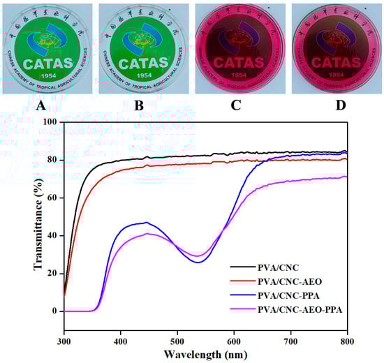 Photograph of PVA/CNC (A), PVA/CNC-AEO (B), PVA/CNC-PPA (C), and PVA/CNC-AEO-PPA (D) film, and the UV-vis light transmittance of smart films.