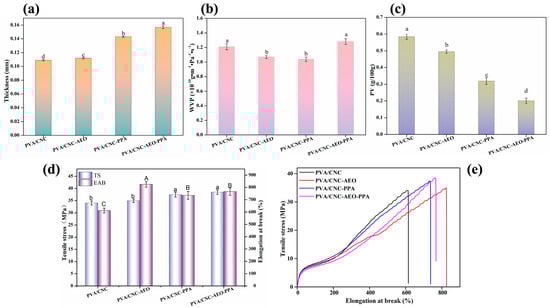 Graphs showing the thickness (a), WVP (b), PV values (c), TS and EAB (d), and the tensile stress-strain curves (e) of the smart films. Different letters between groups indicated a significant difference (p < 0.05).