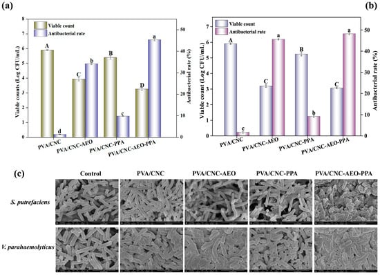 V. parahaemolyticus and S. putrefaciens are common and predominant bacteria in seafood, which is prone to food spoilage and the corrosion of food processing equipment, causing severe health problems and enormous economic losses []. The antibacterial activity of smart films against S. putrefaciens and V. parahaemolyticus was evaluated and the antibacterial rate is shown in Figure 6a,b. When PPA was incorporated into the PVA/CNC film, the viability of S.putrefaciens decreased from 5.99 ± 0.08 log CFU/mL to 5.40 ± 0.07 log CFU/mL, and the viability of V. parahaemolyticus reduced from 6.05 ± 0.03 log CFU/mL to 5.24 ± 0.22 log CFU/mL. The antibacterial rate of the PVA/CNC-PPA film against S. putrefaciens and V. parahaemolyticus reached 9.85% and 9.15%, respectively. This may be because the active polyphenols could enter the bacterial cell membranes and bind to the cellular proteins, thereby inactivating the proteins and limiting bacterial growth []. Of note, PVA/CNC-AEO exhibited better antibacterial activity compared with the PVA/CNC-PPA film. When treated with the PVA/CNC-AEO film, the viability of S. putrefaciens decreased to 3.94 ± 0.07 log CFU/mL, and the viability of V. parahaemolyticus reduced to 3.19 ± 0.08 log CFU/mL. The antibacterial rates of PVA/CNC-AEO against S. putrefaciens and V. parahaemolyticus were 34.22% and 45.59%, respectively. The superior antimicrobial activity was ascribed to AEO as the main antibacterial component, which could alter the permeability and integrity of cell membranes, resulting in the leakage of nucleic acids and proteins []. As expected, PVA/CNC-AEO-PPA showed the optimal antibacterial effect. The bactericidal rates of PVA/CNC-AEO-PPA against S. putrefaciens and V. parahaemolyticus reached 45.41% and 48.25%, respectively. The SEM images showed that the bacterial structures underwent collapse, contraction, and adhesion after treatment with PVA/CNC-AEO and PVA/CNC-AEO-PPA, leading to the death of the bacteria (Figure 5c). However, the morphology of the bacteria treated with PVA/CNC-PPA hardly changed, which was consistent with its limited antibacterial activity. The above results proved the potential of PVA/CNC-AEO-PPA films to extend the shelf life of food products.