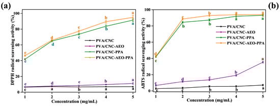 As seen in Figure 7, the PVA/CNC film revealed poor antioxidant activity due to the lack of effective antioxidant components, while the scavenging capability of PVA/CNC films on the DPPH and ABTS radical were significantly enhanced by PPA addition (p < 0.05). Potent antioxidant activity was related to PPA, which comprised positively charged compounds (flavylium cations) at the oxygen atom of the C-ring of the flavonoid skeleton that would promote the transfer of hydrogen atoms for radical inhibition []. A significantly higher DPPH radical scavenging ability of 91.43% and relatively higher ABTS radical scavenging ability of 92.95% were found in 5 mg/mL of the PVA/CNC-PPA film. The above results are probably due to the fact that both PPA and AEO possess phenolic compounds that can contribute hydrogen atoms. Simultaneously, the obtained radical scavenging ability in the ABTS assay was higher than that in the DPPH assay. The reason might be that DPPH radicals are more sensitive to the reaction environment; small changes in solvent, pH, or temperature might have a more significant effect on the measurement results, leading to higher variability. In addition, the absorbance of the DPPH radical decreased in the presence of light, and the ABTS assay was less susceptible to the interference of PPA color due to the higher wavelength used [].