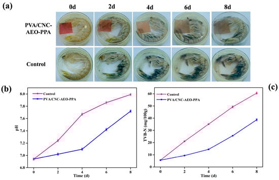The application of the target film (PVA/CNC-AEO-PPA) in mantis shrimp preservation and freshness monitoring was validated. The films (3 cm × 3 cm) were affixed on the upper surface of the inside of sterile Petri dishes (diameter: 90 mm) containing fresh mantis shrimp (30 g), sealed with parafilm, and then stored at 4 °C for 8 days. The color change of the films was observed at 2-day intervals. The freshness of the mantis shrimp was determined by testing the TVB-N and pH []. The TVB-N of the mantis shrimp was tested according to GB 5009.228-2016 (semi-micro method) [].