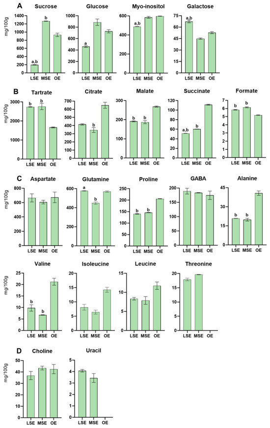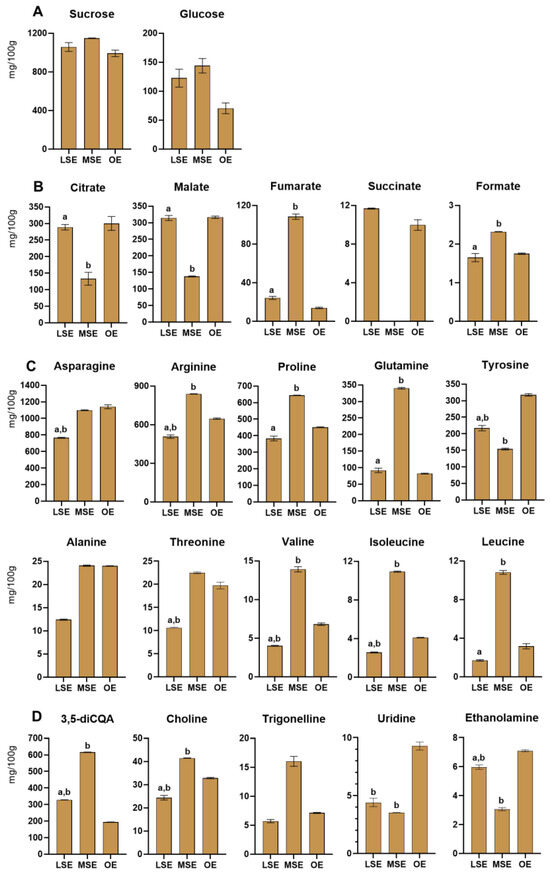 Histograms relative to compounds quantified (mg/100 g of dried sample ± SD) in the Bligh–Dyer hydroalcoholic extracts of Lemon balm in the Land Spontaneous Ecotype (LSE), Mountain Spontaneous Ecotype (MSE), and Organic Ecotype (OE). (A) Sugars, (B) organic acids, (C) amino acids, and (D) other metabolites. One-way ANOVA, followed by Tukey’s multiple comparison test, was applied to underline, among ecotypes, significant differences (p < 0.0001) for each metabolite: (a) vs. MSE; (b) vs. OE.