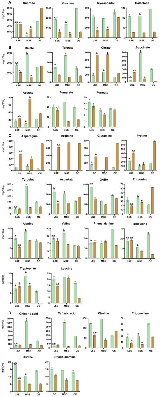 Histograms relative to compounds quantified (mg/100 g of dried sample ± SD) in the Bligh–Dyer hydroalcoholic extracts of Dandelion in Land Spontaneous Ecotype (LSE), Mountain Spontaneous Ecotype (MSE) and Organic Ecotype (OE), comparing the difference between aerial part (green) and root (brown). (A) Sugars, (B) organic acids, (C) amino acids, and (D) other metabolites. Two-way ANOVA, followed by Tukey’s multiple comparison test, was applied to underline, among ecotypes, significant differences (p < 0.0001) for each metabolite according to the same plant part: (a) vs. MSE; (b) vs. OE.