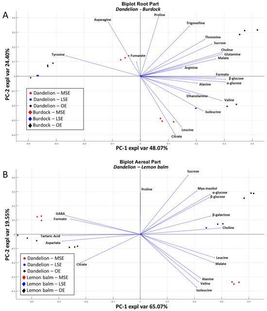 PCA model of (A) root parts of Burdock and Dandelion; (B) aerial parts of Lemon balm and Dandelion. The points represent the samples, while the lines represent the directions of growth of the plants’ metabolites. In (A), the Dandelion samples are represented by circles and the Burdock samples are represented by diamonds. The ecotypes are differentiated by colours: red for MSE, blue for LSE, and black for OE. In (B), the Dandelion samples are represented by circles and the Lemon balm samples are represented by diamonds. The ecotypes are differentiated by colours: red for MSE, blue for LSE, and black for OE.