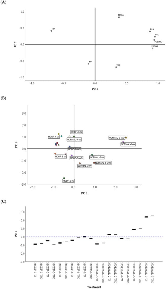 Figure 1B, the scattering of the treatments with and without OG + LCE was gradually transformed over storage time, as well as the presence or lack of presence of this combination. Packaging treatment samples were moved towards the right along the PC2 axis. From NA packaging on the ninth day onwards to MA samples on the sixth day, the last samples contained lower MRSA counts. Moreover, MA treatments with OG + LCE on the second and sixth days were placed opposite the MRSA counts. LAB were the predominant spoilage microorganisms in refrigerated-stored fresh meat under MA generating off-flavours, slime, and discoloration [