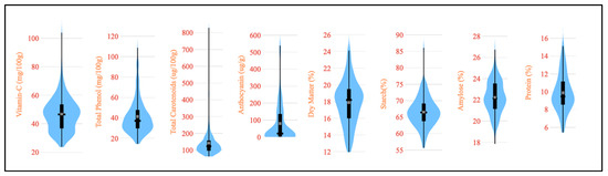 The evaluation of important nutritional traits for 120 diverse potato germplasms is summarized in Table 1, while the trait variability is illustrated in Figure 2 through violin plots. Our studied germplasm had a vitamin C content from 23.7 to 103.9 mg per 100 g on a fresh weight basis. This finding is in agreement with vitamin C evaluation in forty-eight Indian potato varieties from 19.4 to 58.4 mg per 100 g on a fresh weight basis [32]. The analyzed germplasms showed that the total phenol content varied between 14.5 and 108.7 mg per 100 g on a fresh weight basis. Previously, the total phenol content in four popular potato varieties was reported to range from 101.8 to 299.1 mg per 100 g [33]. We studied the total carotenoid content on a fresh weight basis among the germplasm and observed a range from 61.9 to 829.6 µg per 100 g on a fresh weight basis. Our reported range was wider than the results obtained by Tatarowska et al. for potato tubers from Poland [34]. However, the analysis of 152 potato germplasms in S. phureja, exhibited a broad range of total carotenoid contents, ranging from 103 to 2135 µg per 100 g on a fresh weight basis [3]. Our study evaluated germplasms for anthocyanin content and the trait ranged between 0.33 and 539 µg per g on a fresh weight basis. Similarly, an anthocyanin content of 11–174 mg per 100 g on a fresh weight basis was reported by Reyes et al. for purple- and red-fleshed potatoes from Texas, USA [35]. The dry matter content, an important biochemical attribute of potatoes, ranged from 11.95 to 24.11% among the studied germplasms. Similar findings, ranging from 14.1 to 35.2%, have been reported for potatoes [13,36]. Starch is also an important biochemical constituent and the results of our study, on a dry weight basis, showed variability from 55.7 to 86.1% among the germplasm. This range is consistent with the reported 83–90% in ten varieties and 69.4–72.3% in four varieties [37,38]. The range of protein content on a dry weight basis found in the germplasm was between 5.43 and 15.1%, confirming the reported range of 4.93 to 12.3% [36]. The amylose content varied from 17.9 to 26.7%, with several reports mentioning a range of 18–29% in potatoes on a dry weight basis [39,40].