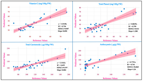 A paired t-test with a 95% confidence interval was used to assess if the mean of the dependent variable matched the analytical and predicted values for the investigated biochemical parameters [31]. In our findings, the p-value was greater than 0.05, indicating the precision and dependability of the models (Table 4). The p-values were as follows: vitamin C (0.429), total phenol (0.173), total carotenoids (0.115), anthocyanin (0.171), dry matter (0.190), starch (0.112), amylose (0.766), and protein (0.973). Therefore, the means of the NIRS method and the standard methods used to assess the traits were found to be not statistically different from one another.