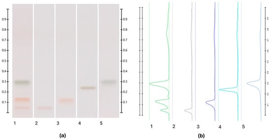 An example of an HPTLC chromatogram showing the separation of sugars. Images were taken at T white light; (a) Track 1—honey sample, track 2—trehalulose standard, track 3—fructose standard, track 4—sucrose standard, and track 5—glucose standard; (b) their respective chromatograms.