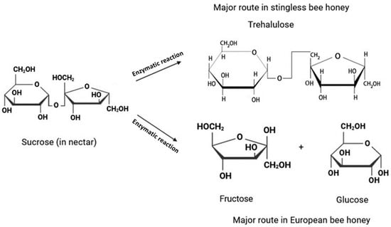 Stingless bee honey exhibits a distinctive sugar profile primarily due to the abundant presence of trehalulose, a rare disaccharide recently identified in stingless bee honey from various regions that has been, therefore, proposed as a marker compound for this kind of honey [16]. Trehalulose is considered important for distinguishing between stingless bee honey and honey produced by European honey bees. The latter typically consists of fructose as the most abundant sugar (approximately 32–38%), followed by glucose. In contrast, stingless bee honey is primarily characterised by the presence of the disaccharide trehalulose [16,38].