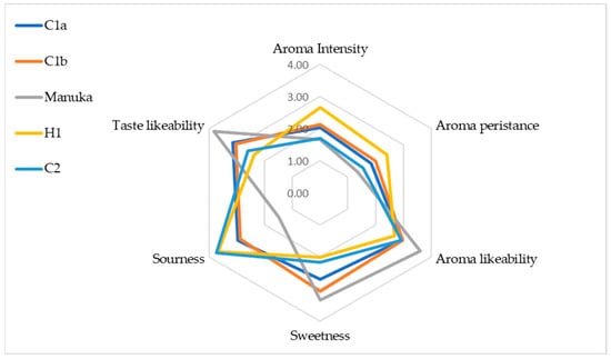 As can be observed in Figure 4, the stingless bee honey used in this study had a more intense and persistent aroma compared with the New Zealand Manuka honey. In terms of sourness, stingless bee honey samples were also found to be sourer than the comparator honey. Samples C2 and H1 were the sourest, with mean scores of 3.73 and 3.67, respectively. In contrast, Manuka honey showed the lowest sourness, with a mean score of 1.50. This observation is in line with the findings of other studies, which also attributed the distinctive sour taste of stingless bee honey to its high content of polyphenolic compounds, particularly phenolic acids. The phenolic acids are likely also responsible for the low pH observed in most stingless bee honey [1,45].