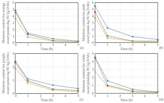 Experimental results of the drying process for four sweet potato varieties were presented in Figure 1, Figure 2 and Figure 3, where the moisture content, WL, and SG of samples were recorded according to different temperatures.