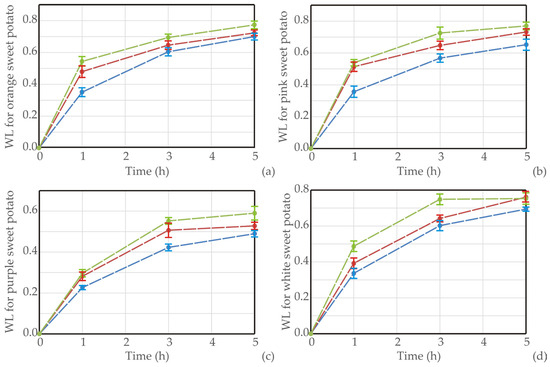 Graphical presentation of WL during OD of (a) orange, (b) pink, (c) purple, and (d) white sweet potato samples in sugar beet molasses at different temperatures (blue line for 20 °C, red for 35 °C, and green line for 50 °C), n = 3 measurements.