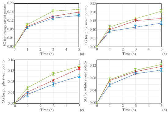 Graphical presentation of SG during OD of (a) orange, (b) pink, (c) purple, and (d) white sweet potato samples in sugar beet molasses at different temperatures (blue line for 20 °C, red for 35 °C, and green line for 50 °C), n = 3 measurements.