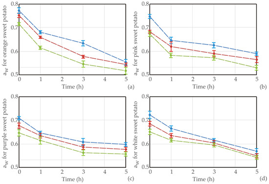 Graphical presentation of aw during OD of (a) orange, (b) pink, (c) purple, and (d) white sweet potato samples in sugar beet molasses at different temperatures (blue line for 20 °C, red for 35 °C, and green line for 50 °C), n = 3 measurements.