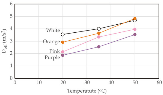 Figure 5 presents the major results for sweet potato samples, including orange, pink, purple, and white varieties, at different temperatures. As the temperature increases from 20 °C to 50 °C, there is a noticeable trend of increasing values for the effective diffusion coefficient (Deff) across all sweet potato types. For orange sweet potatoes, Deff values increase from 2.92 × 10−10 m2/s at 20 °C to 4.83 × 10−10 m2/s at 50 °C. Similarly, pink sweet potatoes exhibit a rise in Deff values from 2.14 × 10−10 m2/s to 3.96 × 10−10 m2/s across the same temperature range. Purple sweet potatoes also show an increase in Deff values from 1.85 × 10−10 m2/s to 3.54 × 10−10 m2/s, while white sweet potatoes demonstrate a rise from 3.55 × 10−10 m2/s to 4.68 × 10−10 m2/s. The differences in Deff values could be attributed to the variation in chemical composition of the samples [33].