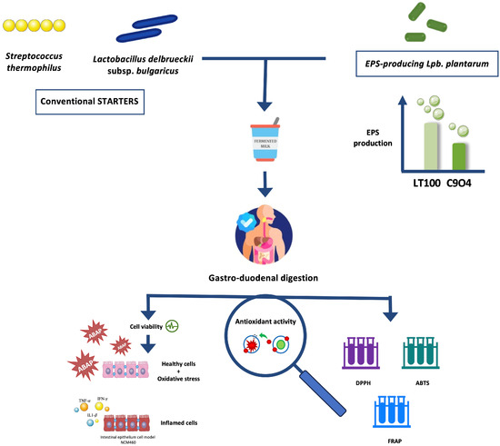 Based on that, the aim of this study was to investigate the ability of some food-borne Lpb. plantarum to enhance the antioxidant activity of fermented milks by producing EPSs during the fermentation process, using an innovative approach that combines the in vitro screening and evaluation of Lpb. plantarum strains to be selected for the lab-scale fermentation process with the evaluation of the anti-inflammatory activity of Lpb. plantarum-enriched fermented milks via ROS modulation by using an inflamed intestinal model. Firstly, Lpb. plantarum strains isolated from fermented foods were selected based on their EPS production in fermented milks, and then the antioxidant activity of EPSs produced during fermentation was investigated in vitro. Furthermore, ROS modulation by fermented milks containing EPSs was evaluated in an intestinal epithelium model derived from the colonic mucosa of a healthy individual (NCM460), in which both oxidative and inflammatory stresses were induced. The putative impact of the digestion process on the biological activity of fermented milks was also considered. Figure 1 shows a graphical scheme of the experimental design of this study.