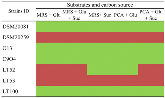Ruthenium Red plate assay for EPS-producing screening. (Glu: glucose, Suc: sucrose) in different culture media. Green boxes refer to ropy (EPS-producers) and red boxes to non-ropy strains (non-EPS producers).
