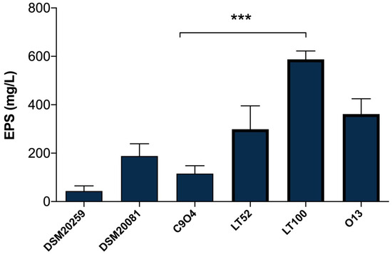 EPSs quantification in Lpb. plantarum-enriched fermented milks was carried out with the phenol–sulfuric acid method [26], which is a simple, practical, and widely used method to quantify total polysaccharides in food samples. As shown in Figure 3, the results highlight a different amount of EPSs produced among Lpb. plantarum strains, allowing those with a higher and lower capability to produce EPSs to be selected. The EPSs production among Lpb. plantarum strains ranged from 115.55 (for C9O4) to 587.77 mg/L (for LT100) glucose equivalent (Figure 3); thus, C9O4 was selected as the lowest EPS producer and LT100 as the highest EPSs producer, among the tested strains. Moreover, the results of S. thermopilus DSM20259 and Lb. delbrueckii subsp. bulgaricus DSM20081 confirmed that the amount of EPSs production by conventional starters may have no impact on the final product, showing a minimal ability to produce EPSs compared to that of Lpb. plantarum strains that showed a greater EPS-producing ability in a strain-dependent manner, as also recently reported [36,37,38,39]. The capability to produce EPSs depends on several key factors influencing bacterial growth (e.g., temperature, incubation time, pH, oxygen rate, and carbon and nitrogen sources) and the amount of EPSs production is largely strain-specific [8]. Thus, the selection of EPS-producing strains provides an important tool to improve the technological and functional properties of dairy products [8].