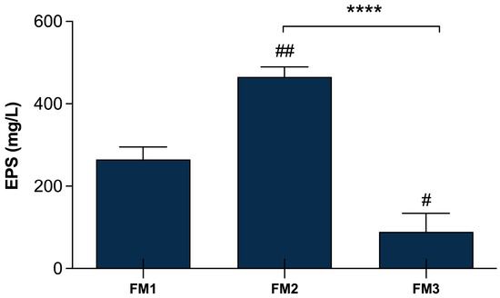 EPSs production in fermented milk samples. FM1 fermented by S. thermophilus DSM20259 and L. delbrueckii subsp. bulgaricus DSM20081; FM2 fermented by S. thermophilus DSM20259, L. delbrueckii subsp. bulgaricus DSM20081, and Lpb. plantarum LT100; FM3 fermented by S. thermophilus DSM20259, L. delbrueckii subsp. bulgaricus DSM20081, and Lpb. plantarum C9O4. Data are reported as mean values ± SEM and they are expressed as mg/L glucose equivalent. Statistical analyses were performed by One-Way ANOVA followed by Tukey’s multiple comparisons post hoc test (FM1 vs. FM2 ## p < 0.005; FM1 vs. FM3 # p< 0.05; FM2 vs. FM3 **** p < 0.0001).