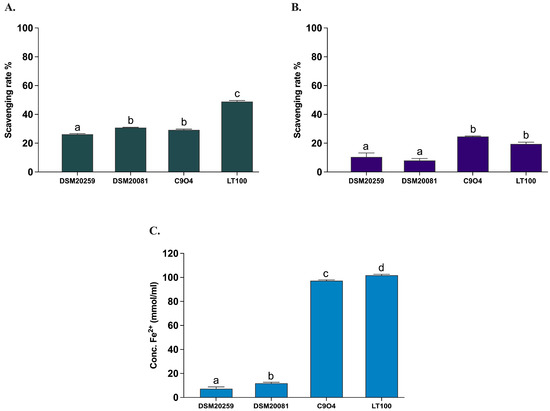 All Lpb. plantarum strains have been previously tested and selected for their antioxidant activity in vitro [21]. In this study, the antioxidant activity of the two conventional starter strains S. thermophilus and Lb. delbruckeii subsp. bulgaricus was evaluated by measuring the in vitro DPPH and ABTS radical scavenging activities, as well as the ferric iron reducing capacity (FRAP) according to Prete et al. [21]. Lpb. plantarum strains (C9O4 and LT100) were included in the assays to confirm the analysis previously carried out by Prete et al. [21]. As shown in Figure 5, the antioxidant capacity of the two conventional starters was minimal (DPPH < 10%, ABTS < 30%, and FRAP < 20 mmol Fe2+/mL) and significantly lower compared to that of the Lpb. plantarum strains, for which an ROS neutralization activity >20% for DPPH and >30% for ABTS and a FRAP >100 mmol Fe2+/mL were confirmed, as already reported [21].