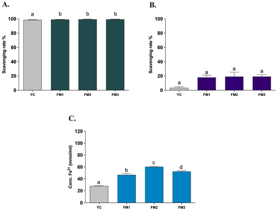 Antioxidant activity of fermented milks evaluated by (A) ABTS, (B) DPPH, and (C) FRAP assays. YC = commercial yogurt, FM1 = fermented milk produced by conventional starters, FM2 = fermented milk produced by conventional starters and Lpb. plantarum LT100 (high-EPS producer), FM3 = fermented milk produced by conventional starters and Lpb. plantarum C9O4 (low EPS producer). Data are reported as mean values ± SEM and statistically analyzed by One-Way ANOVA followed by Tukey’s multiple comparisons test (different letters mean significant differences among samples p < 0.0001).