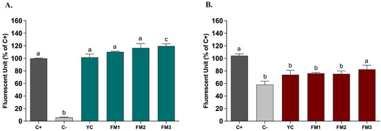 Based on the in vitro evidence regarding the enhanced ability to partially neutralize ROS, we tested the potential protective impact of digested samples (20 μL/mL) on ROS modulation, by applying the DCFH-DA (dichlorofluorescein-diacetate) assay in two different intestinal models [21]. Figure 8 shows the results, expressed as % inhibition of ROS levels released by intestinal cells compared to the positive control, represented by NCM460 cells in which the release of ROS was induced by ABAP, in order to mimic induced oxidative stress. As reported in Figure 8, in this healthy epithelium model, there is no significant difference in ROS release compared to the positive control (Figure 8A). In order to evaluate the potential protective impact, the samples were also tested in the same way in an intestinal model of induced inflammation [24]. Interestingly, Figure 8B shows, for all samples, a protective effect of the inflammatory status through a reduction in the release of ROS content. In particular, sample FM2 (enriched with Lpb. plantarum LT100) confirmed a significant reduction compared to the positive control (inflamed NCM460 cells), higher than sample FM3 (enriched by Lpb. plantarum C9O4), suggesting a putative positive role of EPSs produced during fermentation in ameliorating inflammation.