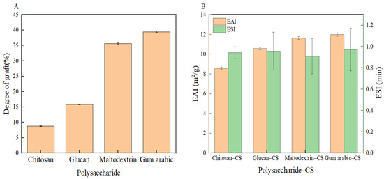 Degree of grafting of CS and different polysaccharides (A); emulsification properties of CS and different polysaccharides (B).