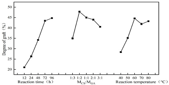 As shown in Figure 2, the degree of grafting with an increasing reaction time showed a gradually increasing trend, and the reaction rate was higher before 72 h, while the reaction rate decreased after 72 h. This was mainly because the amino groups of the proteins in the initial stage of the reaction were not fully exposed, the groups of GA were not in sufficient contact with the amino groups, and the exposure of the amino groups was promoted by incubation.
