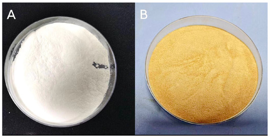 Amounts of 2.000 g of CS and 4.000 g of polysaccharides (glucan, maltodextrin, GA and chitosan) were mixed separately in a beaker, dissolved in 100 mL of ultrapure water, and placed in a magnetic stirrer (YuHua, Model DF-101S, Gongyi Yuhua Instrument Co., Ltd., ZhengZhou, China) at 1000 r/min for 2 h for premixing [25], using a 0.2 mol/L NaOH solution to adjust the pH of 8.0 of the emulsifier hydration solution. The hydrated solution was freeze-dried in a lyophilizer (JinHao, Model FD5 series, Shanghai Jinhao Scientific Instrument Co., Ltd., Shanghai, China) at −50 °C for 48 h. Water can be effectively removed via the lyophilization process, making the emulsifier more stable. Lyophilization of the emulsifier can improve its stability, extend the storage period, and improve the dissolution rate and redispersion. The lyophilized samples were removed and ground using a 100-mesh sieve. The lyophilized samples were removed and ground using a 100-mesh sieve. The sample powder was flatly spread in a Petri dish, wrapped with tinfoil, and tied with small holes, after which it was placed in a desiccator with a saturated KBr solution at the bottom, placed in a constant-temperature incubator (YiHeng, Model DHP-9902, Shanghai YiHeng Scientific Instrument Co., Ltd., Shanghai, China) to ensure that a constant humidity and temperature were maintained during the reaction, sampled and stirred every day, and reacted for a certain period of time to obtain a meladic product of CS–polysaccharides. This product was freeze-dried at −50 °C for 6 h and then placed in the refrigerator at 4 °C for storage until use [26].