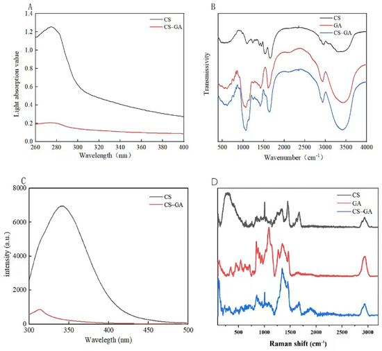UV (A), IR (B), fluorescence (C), and Raman (D) spectroscopy analyses of CS, GA, and CS–GA.