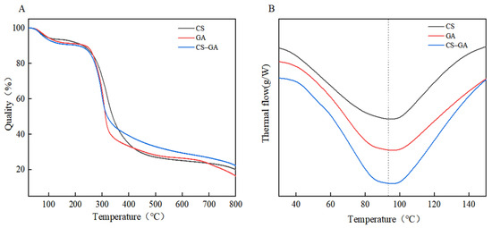 CS, GA, and CS–GA thermogravimetric analyses (A); differential scanning calorimetry (B: Vertical lines indicate thermal absorption peaks).