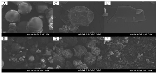 SEM of microstructural changes in CS (A: magnification of 1200×; B: magnification of 500×), GA (C: magnification of 500×; D: magnification of 500×), and CS–GA (E: magnification of 1500×; F: magnification of 100×) powders after freeze-drying.