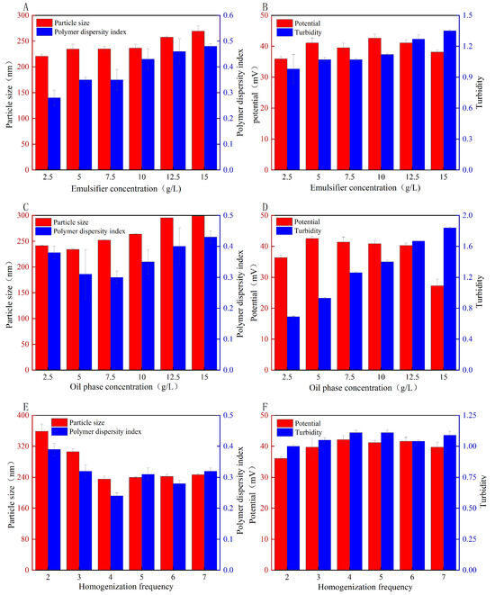 Univariate condition analysis of effect of emulsion. Emulsifier concentration (A,B), oil–phase concentration (C,D), and homogenization frequency (E,F).