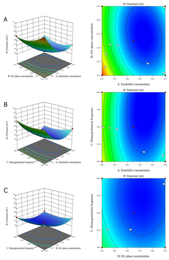 Response surface analysis of emulsions (The red dots indicate Design points, the different colors indicate the range of potentials, from blue to red indicates the potentials from small to large). Response surface and contours of interaction between water and oil concentrations (A); response surface and contours of interaction between emulsifier concentration and homogeneity frequency (B); and response surfaces and contours for interaction between oil–phase concentration and homogenization frequency (C).