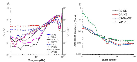 Rheological properties of CS, GA, CS–GA, and WPI emulsions. Variation of the modulus of emulsions prepared with different emulsifiers with oscillation frequency (A) and the apparent viscosity of emulsions prepared with different emulsifiers (B).