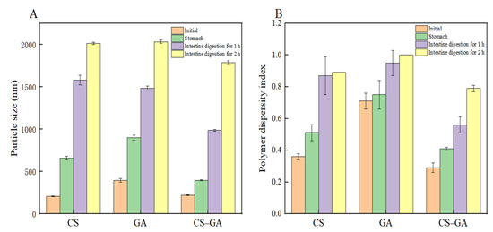 The particle size and PDI of the nanoemulsion of the simulated stomach and simulated small-intestinal digestion at different digestion stages were determined, and the pH of the entire system was maintained at 7.0 by adding a NaOH solution in order to mimic the environment of digestion and to ensure that the enzymes function in the most appropriate environment [45].