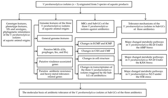 In our previous research, a number of V. parahaemolyticus strains were collected and analyzed from various aquatic animal species [21]. Among these, V. parahaemolyticus B2-28, N9-20, and N2-5 isolates exhibited MDR phenotypes. Hence, we asked what the genome features of the isolates could be and what the molecular mechanism underlying the resistance phenotypes could be. Thus, the primary objectives of this study were (1) to determine draft genome sequences of the three V. parahaemolyticus isolates of aquatic animal origins; (2) to identify MGEs as well as virulence- and resistance-related genes in the V. parahaemolyticus genomes; (3) to investigate the survival of the V. parahaemolyticus strains under different concentrations of antibiotics (AMP, KAN, and STR); and (4) to decipher the molecular mechanism underlying the tolerance of the V. parahaemolyticus strains to the antibiotics through biochemistry, comparative genomics, and transcriptomics analyses (Figure 1). The findings of this study will contribute to the genome data of V. parahaemolyticus and facilitate the control of this foodborne pathogen worldwide.